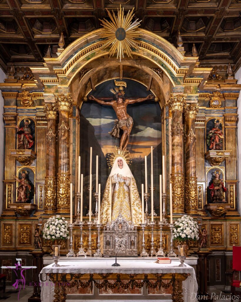 En la cabecera de la Capilla se encuentra el retablo mayor, de estilo neoclásico, dividido en tres calles, La central está enmarcada por cuatro columnas de estilo compuesto. La zona superior del retablo está rematada por un ático. Las calles laterales presentan dos hornacinas colocadas verticalmente y coronadas por un arco de medio punto, incluyendo dos pilastras adosadas con decoración vegetal coronadas con pináculos. Su uso ha sido ininterrumpido desde su ejecución como retablo del altar mayor en la Capilla del Museo hasta hoy, que sigue sirviendo para el mismo fin por el que fue creado, siendo eje central de la capilla y telón de fondo de todos los ritos y ceremonias católicas celebradas en dicho espacio por la Hermandad. El retablo es una obra del siglo XIX, realizada tras la invasión francesa (1809-1812), momento en el que la Capilla del Museo es arrasada y expoliada, perdiéndose la mayor parte de sus bienes muebles, altares y obras de arte.