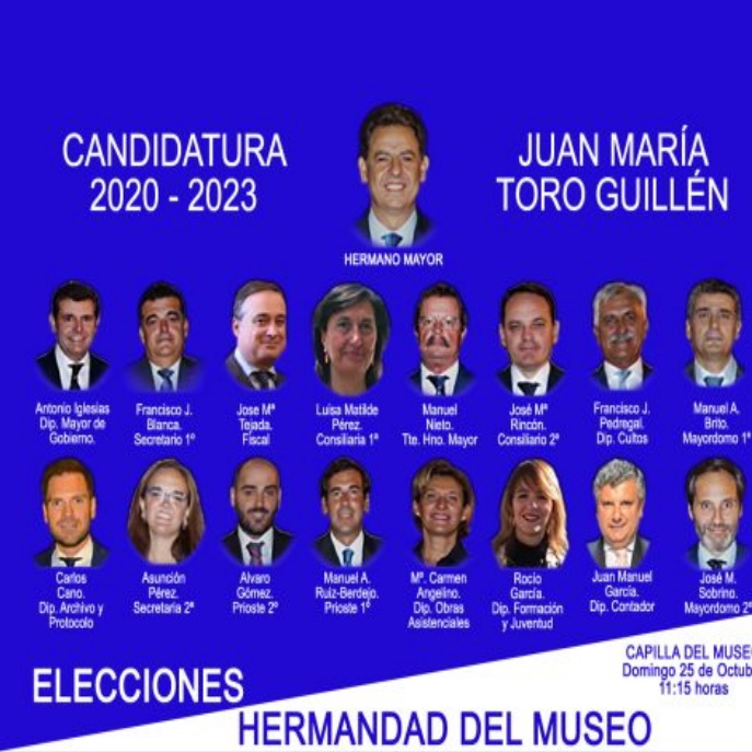 En consecuencia, quedó proclamada la Junta de Gobierno encabezada por nuestro Hermano Juan María Toro Guillén como Hermano Mayor, una vez se apruebe definitivamente por la Autoridad Eclesiástica.